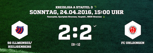 SG Illmensee/Heiligenberg – FC Uhldingen 2:2 (0:1) – Tore: 0:1 Dimitrov (25.), 1:1 Weber, J. (67.), 2:1 Huttner (70.), 2:2 Scheitler (85.) – Schiedsrichter: Laemmle (Bad Waldsee) – Zuschauer: 50 – In der ersten Spielhälfte waren die Gäste aus Uhldingen spielbestimmend. Nennenswerte Tormöglichkeiten gab es jedoch nicht. Nach einem Fehler in der Illmenseer Abwehr nutzte Dimitrov seine Chance und brachte die Gäste in Führung. Nach dem Kabinengang besannen sich die Platzherren und traten druckvoller auf. Weber stellte nach einem Doppelpass mit Mutter den überfälligen Gleichstand her und schon drei Minuten ging die SG durch Huttner nach einem Freistoß von Rauch in Führung. Den Ausgleich und zugleich leistungsgerechten 2:2-Endstand stellten die in der Schlussphase wieder überlegenen Uhldinger mit einem Schuss von Scheitler aus 25 Metern her.