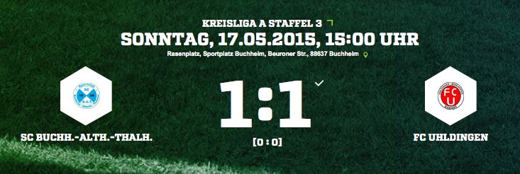 SC Buchheim/Altheim/Thalheim – FC Uhldingen 1:1 (0:0) – Tore: 0:1 Krafcsik (60.), 1:1 Straub (65.) – Schiedsrichter: D’Arca (Salem) – Zuschauer: 80 – Da der SC Buchheim/Altheim/Thalheim längst das vordere Mittelfeld erreicht hat und der FC Uhldingen den Klassenerhalt ebenfalls sicher in der Tasche hat, stand in Buchheim für keinen der Gegner etwas auf dem Spiel. Trotzdem zeigten die Mannschaften hohes Engagement. Es kam hüben wie drüben zu zahlreichen Torchancen, die aber wegen des Unvermögens der Angreifer oder der starken Torhüter Schalk im Buchheimer Tor und Hübschle im Kasten der Uhldinger nicht zu Zählbarem führten. Krafcsik brachte die Gäste mit einem Schuss aus 18 Metern in Führung. Im Gegenzug zirkelte Straub einen direkten Freistoß aus 20 Metern zum gerechten Remis ins Buchheimer Netz.